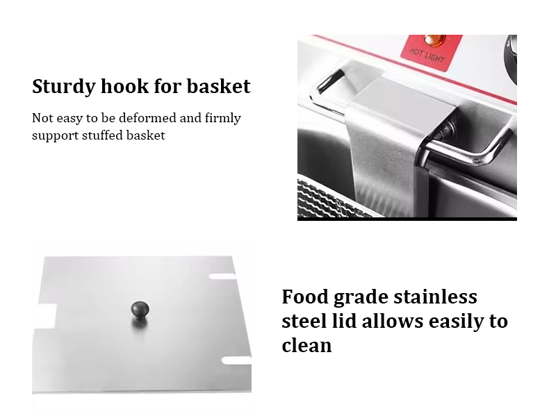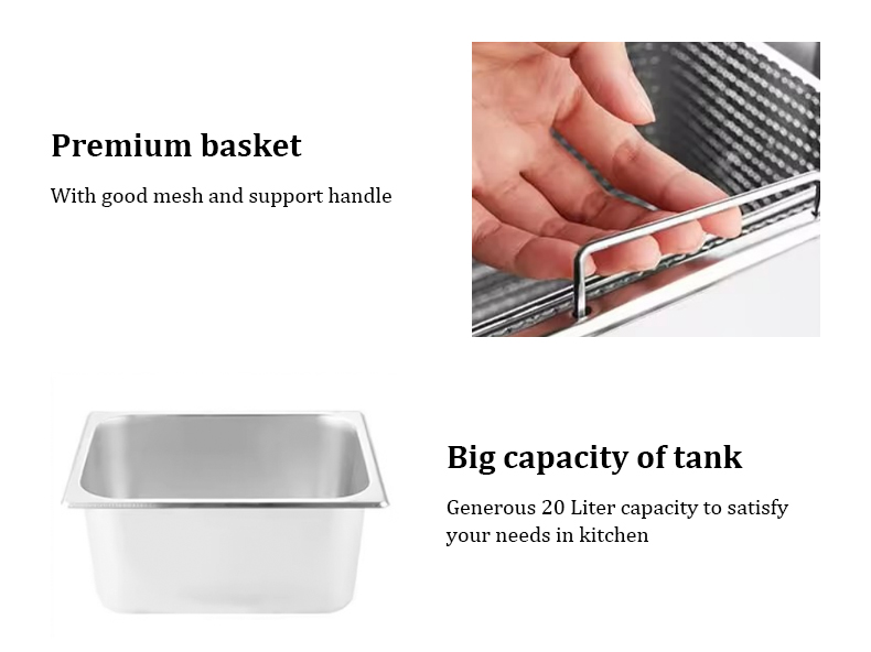 - Commercial-Grade Frying Basket: Comes with an oversized basket that handles substantial food volumes. Its optimized perforation ensures maximum oil drainage, while the heat-resistant handle and reinforced hooks provide secure and safe operation. The basket is dishwasher-safe for effortless cleaning.