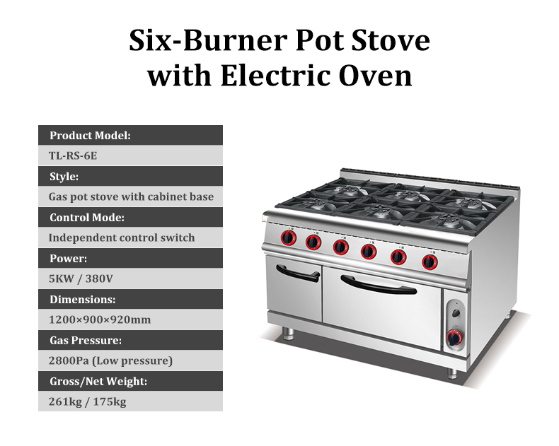 From preparing large batches of soup and gravy to baking fresh bread and roasts, the TL-RS-6E 6-Burner Pot Stove with Electric Oven is the ultimate all-in-one solution for diverse and high-volume cooking tasks.