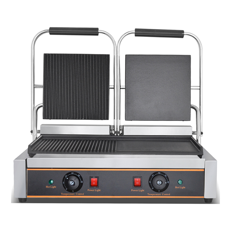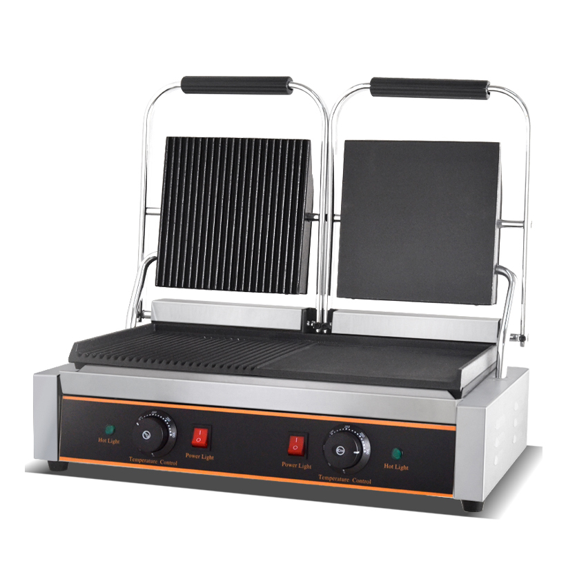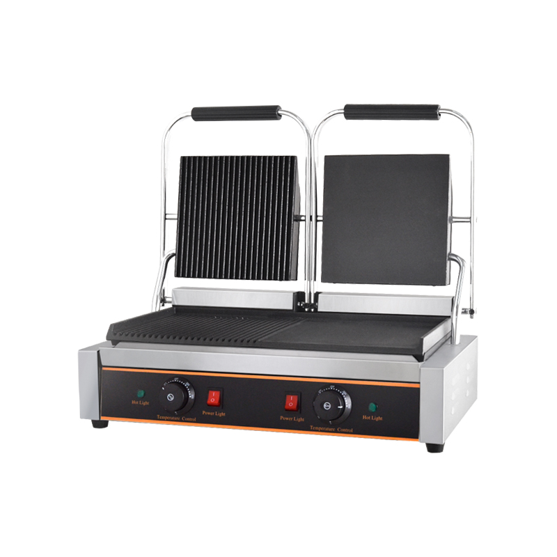 The FY-813B Practical Double-Sided Electric Grill revolutionizes commercial cooking with its innovative dual-pattern design. Featuring both ribbed and flat cooking surfaces, this 3.6KW powerhouse allows you to prepare a wide variety of foods—from perfectly seared steaks with grill marks to flat-grilled paninis and burgers—all on one efficient machine.