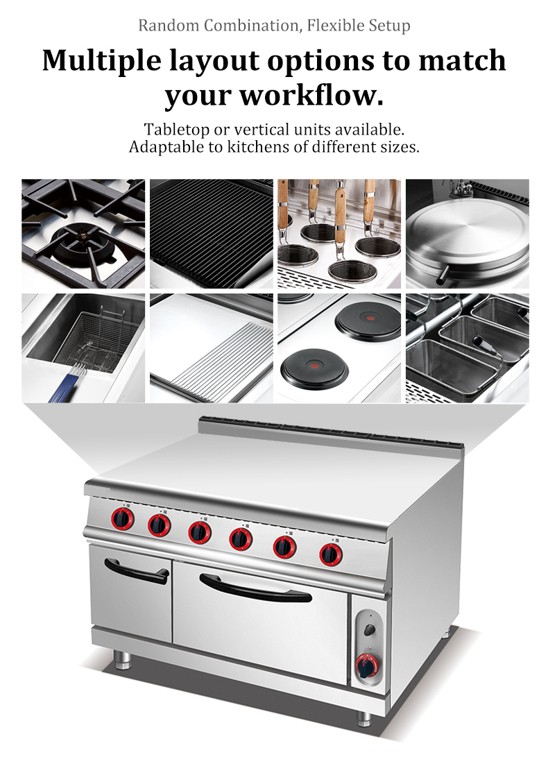 The FD-RS-6A modular commercial kitchen station offers unlimited customization by freely combining grills, fryers, ovens, and more. Choose between gas or electric power, locker or oven bases, and desktop or vertical layouts to build your ideal workflow for central kitchens and chain restaurants.